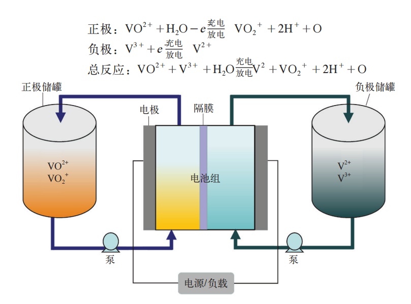 釩電池利用VO2+/VO2+、V2+/V3+兩對(duì)氧化還原電堆的釩離子溶液作為正極和負(fù)極的活性物質(zhì),分別儲(chǔ)存在各自的電解液儲(chǔ)罐中。對(duì)電池進(jìn)行充/放電時(shí),電解液通過泵的作用,由外部?jī)?chǔ)液罐分別循環(huán)流經(jīng)電池的正極室和負(fù)極室,并在電極表面發(fā)生氧化和還原反應(yīng),實(shí)現(xiàn)對(duì)電池的充/放電。