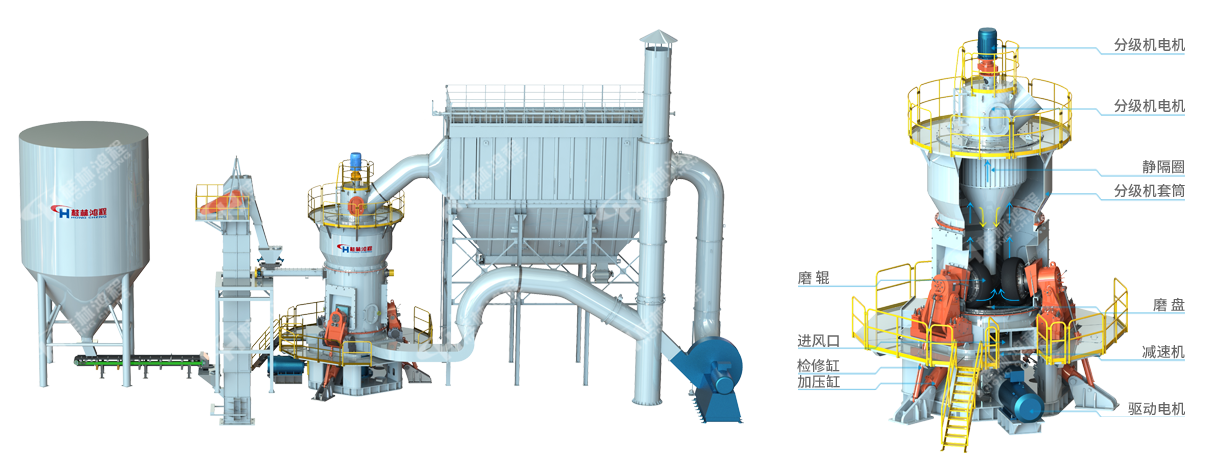水泥生料立磨結(jié)構(gòu)由立磨主機(jī)、存料罐體、皮帶輸送機(jī),定量給料機(jī),料斗、液壓站結(jié)構(gòu)、送風(fēng)管結(jié)構(gòu)和脈沖除塵裝置構(gòu)成。
